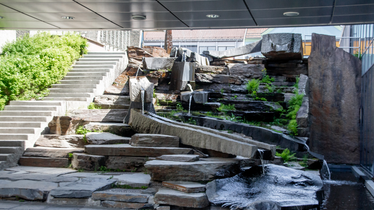 At the Lillehammer Art Museum in Lillehammer, a cascade of stone and water